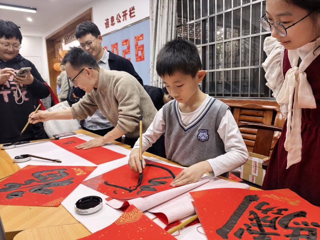 中厅内四大活动区域各有侧重,特邀嘉宾的参与更添专业韵味。书法区前人头攒动,学院特别邀请到地科院林东鹏老师现场挥毫。案台上红纸铺展,笔墨飘香,林东鹏老师凝神运笔,除了传统春联和福字,更应老师们的需求,书写了“年年发刊”“逢投必中”等贴合学术科研的特色内容,笔力遒劲、寓意鲜明。老师们纷纷驻足求取心仪的墨宝,将对学术精进的期许与新春祝福一同收入囊中,不少家属也带着孩子围观学习,感受书法艺术的独特魅力与文字背后的美好愿景。
